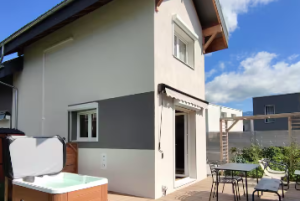 De plein pied, elle comprend une cuisine entièrement équipée (frigo, four, micro onde, cafetière, grille pain, bouilloire, plaque induction et lave vaisselle) avec un accès direct sur l’extérieur ou vous pourrez profiter d’une belle terrasse, du jardin et du spa privatif à remous ( plancha gaz, transat, salon de jardin).